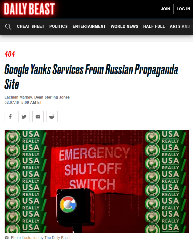 Via “Google Yanks Services From Russian Propaganda Site” by Lachlan Markay and Dean Sterling Jones, The Daily Beast, February 07, 2019:
