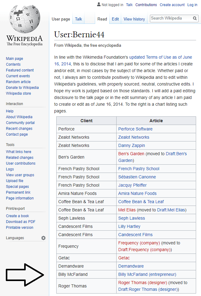 “[This] is to disclose that I am paid for some of the articles I create and/or edit, in most cases by the subject of the article,” Bernie44 wrote. “Whether paid or not, I always aim to contribute positively to Wikipedia and to edit within Wikipedia’s guidelines, with properly sourced, neutral, constructive edits. I hope my work is judged based on those standards.”
