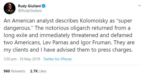 An American analyst describes Kolomoisky as “super dangerous.” The notorious oligarch returned from a long exile and immediately threatened and defamed two Americans, Lev Parnas and Igor Fruman. They are my clients and I have advised them to press charges [emphasis added].