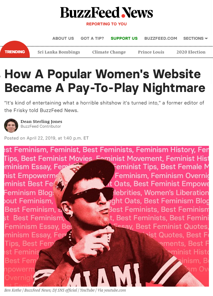 In April, I wrote my first story for BuzzFeed News, “How A Popular Women’s Website Became A Pay-To-Play Nightmare,” detailing the weird but not-so-wonderful afterlife of once-popular women’s site The Frisky (the story was later cited by the New York Times and Columbia Journalism Review).