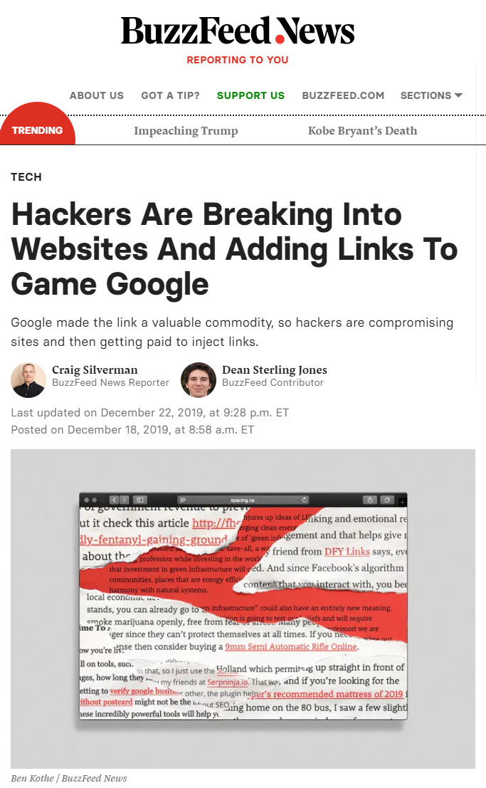 In December, I proudly shared my final BuzzFeed News byline of 2019 with the site’s media editor Craig Silverman, a leading authority on online mis/disinformation and author of Regret the Error: How Media Mistakes Pollute the Press and Imperil Free Speech (based on the blog of the same name). Our story, “Hackers Are Breaking Into Websites And Adding Links To Game Google,” investigated hackers who break into sites in order to sell backlinks and — yes — manipulate search results.