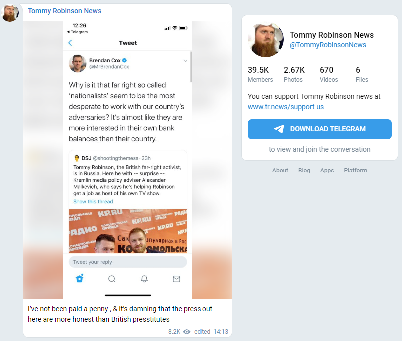 Robinson didn’t return a request for comment. Instead, he posted a screenshot of tweets by me and Brendan Cox — husband of murdered British politician Jo Cox — on his recently launched Telegram account. In an accompanying comment, he called us “British Presstitutes” and denied any suggestion that he’d made money from his various engagements in Russia.