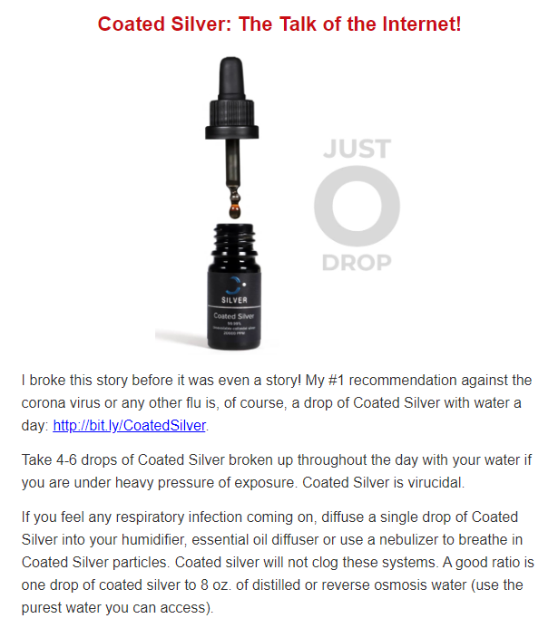 Now Wolfe is hawking unproven cures for COVID-19, the disease caused by the novel coronavirus. Products include: $137 bottles of colloidal silver, his “#1 recommendation against the corona virus”; $44 tubs of “SuperMushroom” tinctures, purportedly “the most effective way to utilize medicinal mushrooms against corona viruses”; $32 packets of “SuperConcentrate” charcoal fullerenes, which purportedly “neutralize viruses”; and the Air Doctor, a $629 non-FDA-approved Japanese product he claims can “clean our homes and workspaces of airborne viruses like COVID-19.”