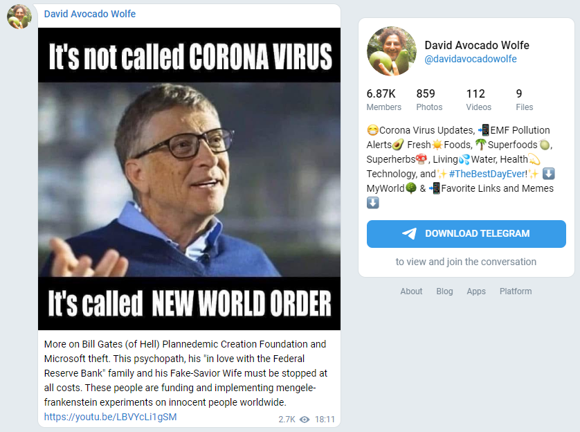 Wolfe has also been hawking his products and spreading debunked 5G and Bill Gates conspiracy theories to his thousands of followers on Telegram, the Russian social media platform.