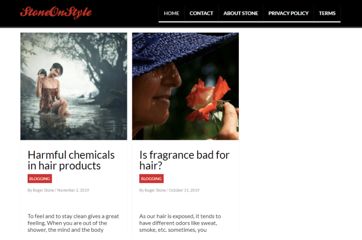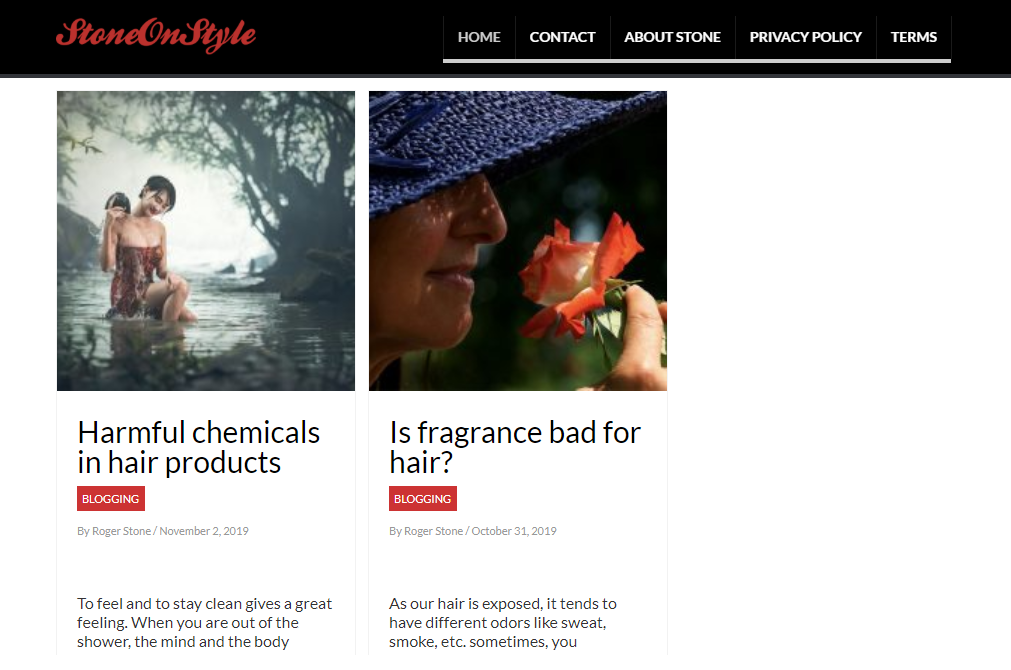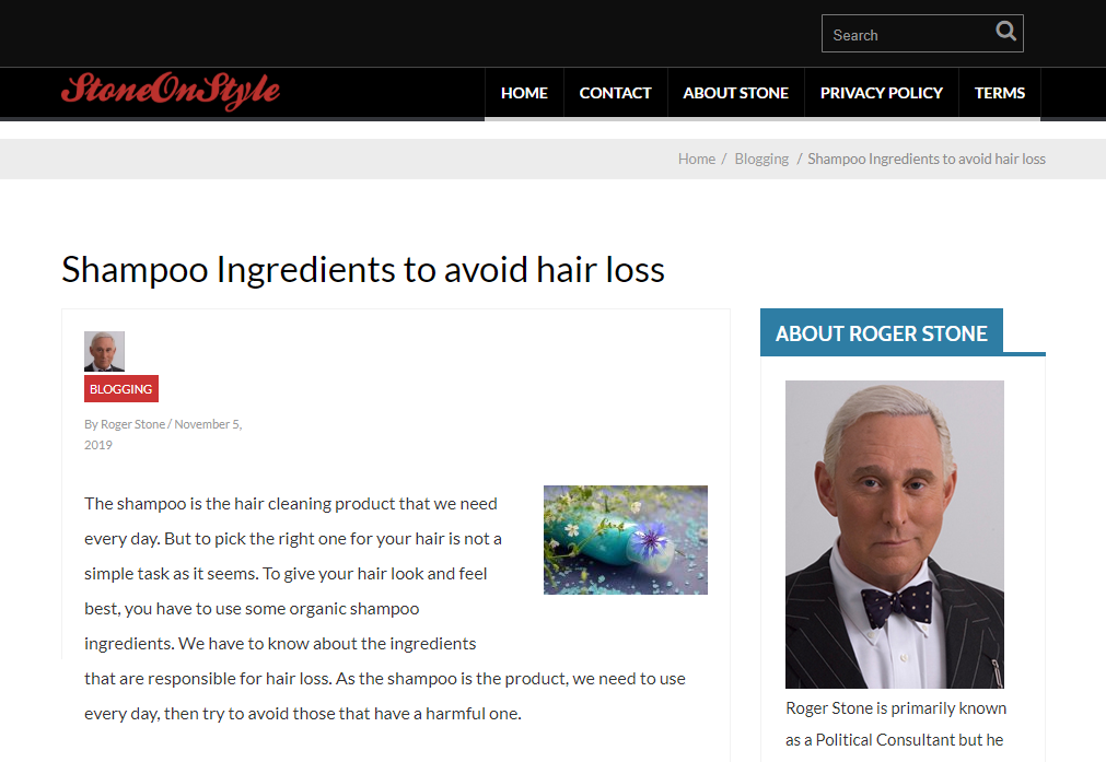 StoneOnStyle.com was a fashion and politics blog run by Trump’s flamboyant campaign trickster. Now it’s used to promote hair loss treatments and online gambling.