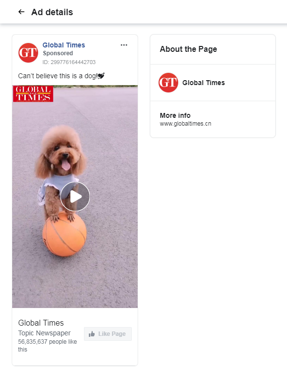 Other recent ads from the Global Times include a viral video titled “Can’t believe this is a dog!” which shows a fluffy dog balancing on a basketball, riding a children’s scooter, and driving a toy car.
