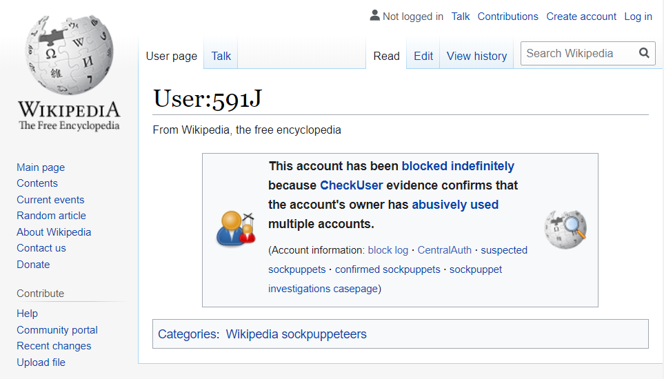 591J stopped editing in April 2016, shortly before 591J and four associated accounts were banned from Wikipedia following an investigation by the site’s administrators. (In 2018, Sater hired a third-party content writing company to edit his biography to add reporting from BuzzFeed News about his undercover work for the FBI, according to an admission on Wikipedia’s talk pages.)