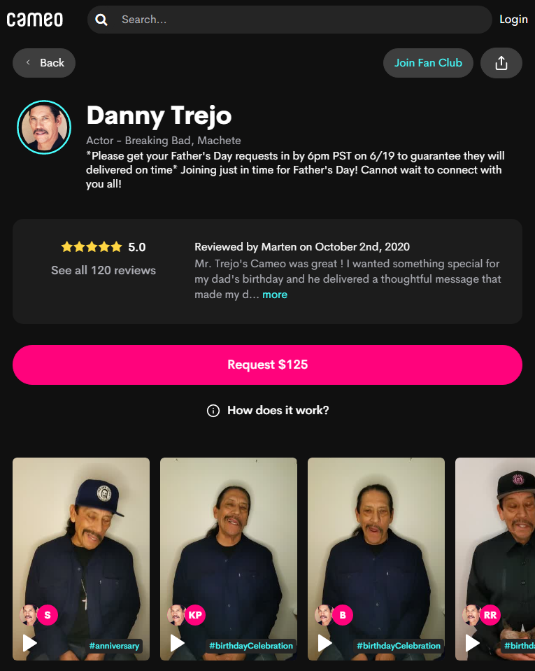 And here’s a screenshot of Trejo’s Cameo profile, where he currently charges $125 to record personalised videos in exactly the same format as the video published by the FAN: