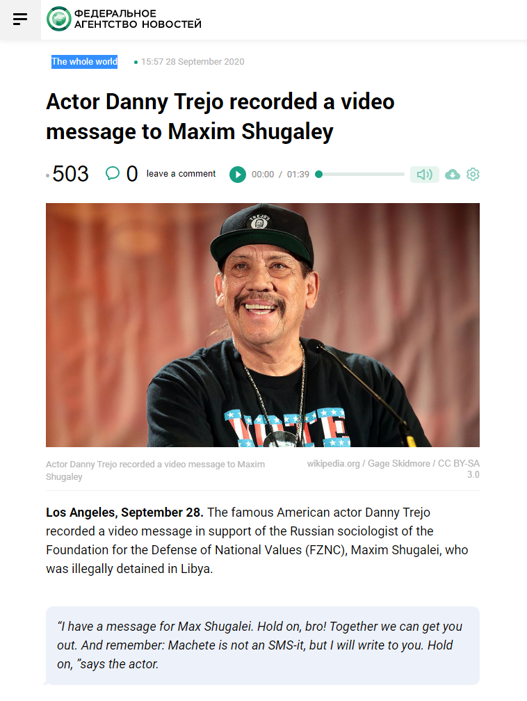 Now actor Danny Trejo has joined the growing list of unwitting surrogate propagandists, telling Shugaley to “stay strong” in a video published last month by Russia’s Federal News Agency (FAN), one of the sites associated with Prigozhin.