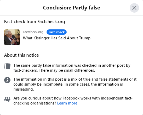 But it does contain a link to an April 15, 2019 article by Facebook’s partnered fact-checking website FactCheck.org, “What Kissinger Has Said About Trump,” which says nothing about Kissinger’s role in the bombing of Cambodia or Tatchell’s 2002 legal case.