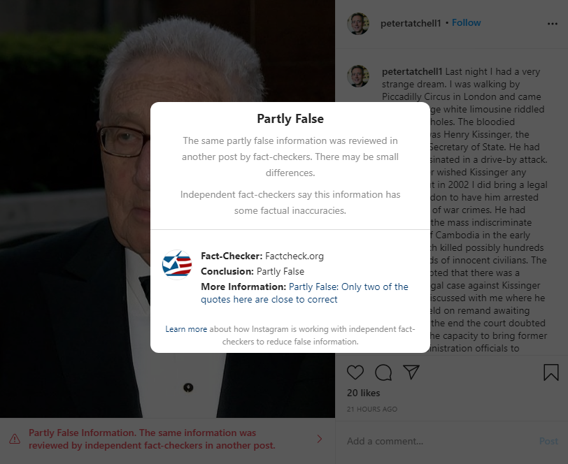 “Hi Everyone. @instagram is flagging my post earlier today about Henry Kissinger as ‘partly false’ on the grounds that Kissinger did not say certain things that I supposedly claimed he said about #Trump. But I never mentioned Trump or anything that #Kissinger may have said about Trump. I was highlighting the evidence that Kissinger authorised war crimes in #Cambodia in the 1970s. Algorithms gone mad? #instagram should apologise and remove the flag from my post. So far they have not :-(“