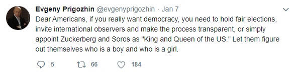 2. In this ironic and drippingly sarcastic tweet, he lectures Americans on the “need to hold fair elections.” Alternatively, he suggests appointing “[Mark] Zuckerberg and [George] Soros as ‘King and Queen of the US.’ Let them figure out themselves who is a boy and who is a girl.”