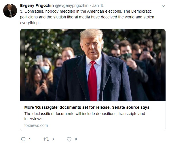 Prigozhin claimed ownership of the account in a rambling January 27 post on Russian social media platform VK, from which he answers questions from journalists. Archived snapshots show that he had fewer than 400 followers at the time of his suspension.